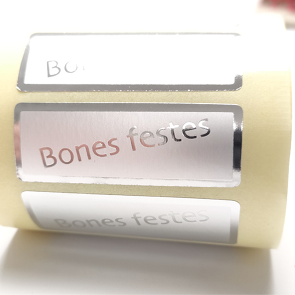 Etiqueta adhesiva “BONES FESTES”. Mesures:: 50X18mm (ancho x alto). Fons Plata mat i text en plata brillant. Rotllo 500 unitats.