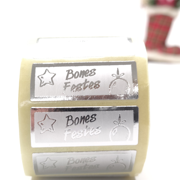 Etiqueta adhesiva “BONES FESTES”. Mesures: 24X18mm (ample x alt). Fons Plata mat, dibuix estrella, bola de nadal i text en plata brillant. Rotllo 500 unitats.