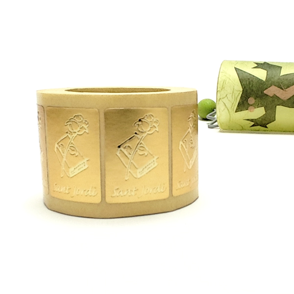 Etiqueta adhesiva Sant Jordi. Mesures: 25X35mm. Colors: fons Or mat, text i dibuix en Or brillant. Rotllo 500 unitats.