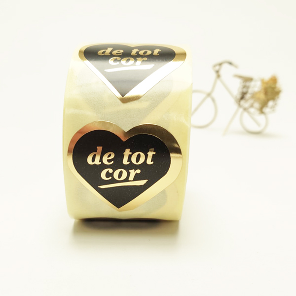 Etiqueta adhesiva “DE TOT COR” Català. Mesures: 40X38mm (ample x alt) en forma de cor. Fons negre mat, text or brillant. Rotllo 500 unitats.